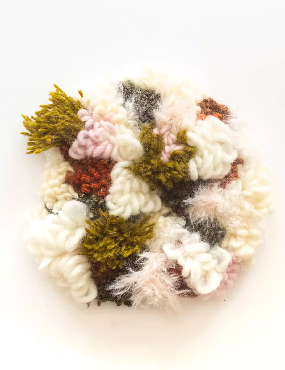 Melissa Sammalvaara is an adventurous artist based in Espoo and various campsites around Finland. Currently she is experimenting on rya, finding new approaches and techniques to combine with more traditional working methods. Sammalvaara creates her artworks - the rya rugs - by hand with various techniques: weaving, knotting and tufting, sometimes even knitting. Nature and our relation to it is a large inspiration for her, which can be seen in her mossy, luscious artworks and the preference in ecological and second hand materials.